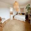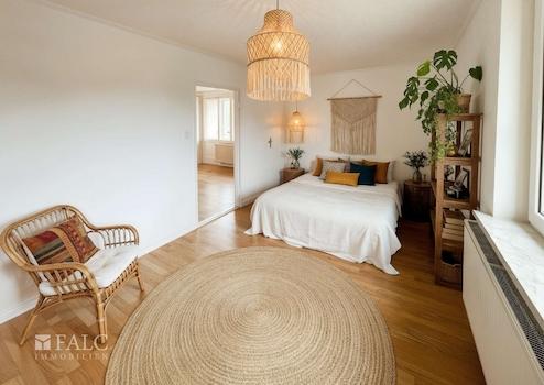 Das Schlafzimmer ist über das Wohnzimmer zugänglich und bietet ausreichend Platz für ein großes Bett und einen Kleiderschrank. Die Ausrichtung und der Blick ins Grüne unterstützen den erholsamen Charakter des Raumes.