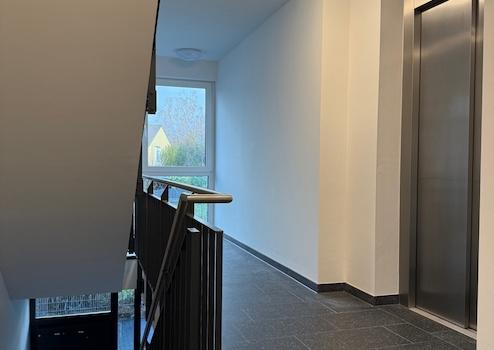 Vom Hauseingang gelangt man sowohl über die Treppe als auch über den Aufzug in das erste Obergeschoss.