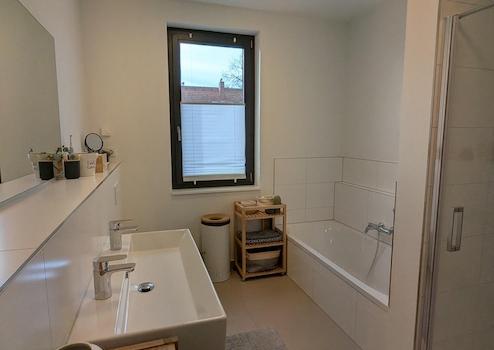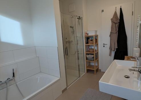 - Tageslichtbad mit großer ebenerdiger Dusche, Badewanne & Doppelwaschbecken