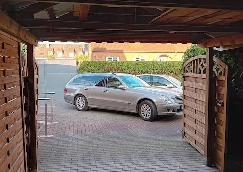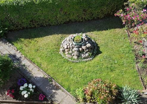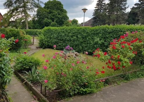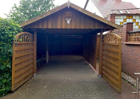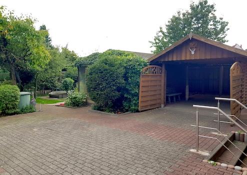 Der hintere Garten mit einer Fläche von 351 m² ist prädestiniert für die Anlage eines Swimmingpools. Hier steht zudem ein wohnliches Gartenhaus, das mit dem daran angrenzenden Carport mit reichlich Nebengelass zur Lagerung von Feuerholz und Gartengeräten ein Ensemble bildet. Die großzügige, gepflasterte Hoffläche hat Platz für zwei weitere Pkw-Stellplätze.
