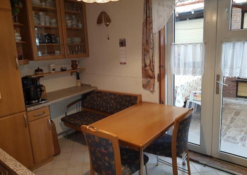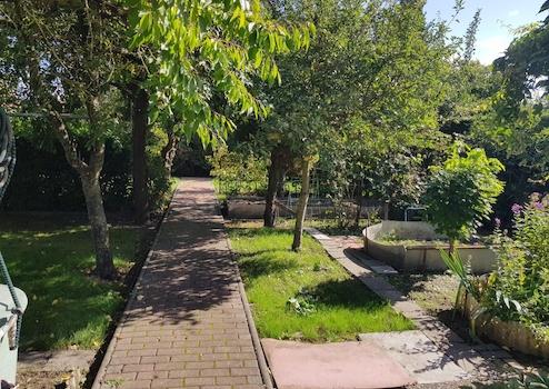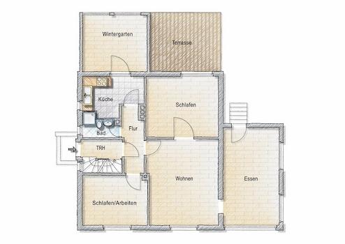 Haus und Grundstück mit drei Zufahrten bieten vielfältige Nutzungsmöglichkeiten und genug Raum für eine große Familie, die sich hier voll entfalten kann. Auf einer Gesamtfläche von rund 118 m² befinden sich im Erdgeschoss ein geräumiges Wohnzimmer (23 m²), ein Esszimmer (20 m²), ein Schlafzimmer mit Einbauschränken (16 m²), ein Kinder- oder Arbeitszimmer (12 m²), ein Bad mit Dusche (2,3 m²) und eine voll ausgestattete, gemütliche Küche (9,3 m²) mit Einbaumöbeln und Zugang zur Terrasse.