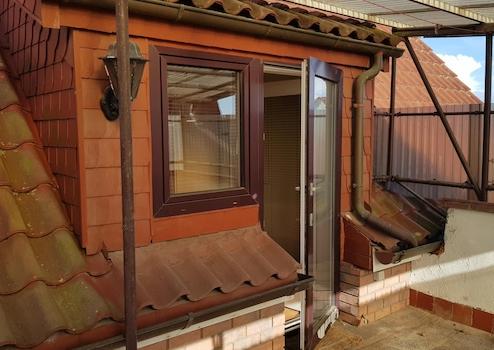 • Trocal Kunststofffenster: außen braun, innen weiß mit Isolierverglasung 4-16-4 mm KS, Schallschutzklasse 2
