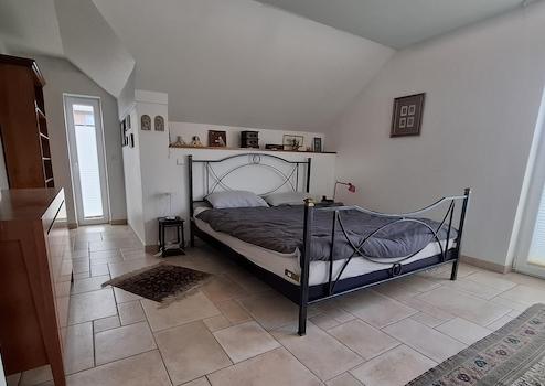 Über ein großzügiges Treppenhaus gelangen Sie ins Obergeschoss mit einem wahrlich großen Schlafzimmer mit Ankleideräumlichkeit und einem kleinen Balkon.