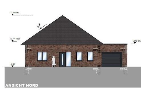 Der Walmdachbungalow wird auf einem Lückengrundstück schlüsselfertig erstellt.
