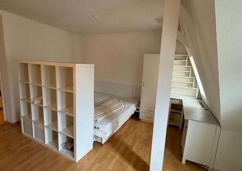 Sie betreten die Wohnung im II. OG und gelangen dann über eine interne Treppe in die Dachebene, welche sich über die gesamte Etage erstreckt.