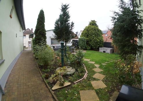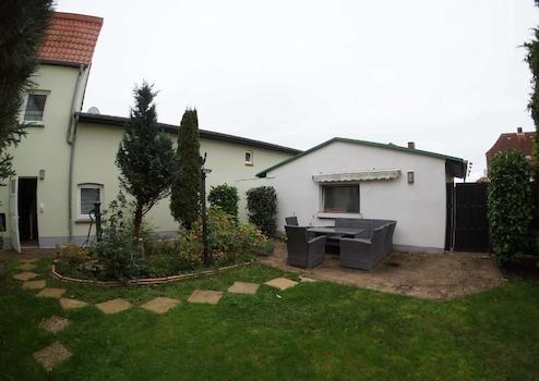 Hinter dem Haus ist ein kleiner Garten, in dem es sich gemütlich sitzen lässt. Neben einer Garage bietet das Grundstück noch zwei Außenstellplätze.