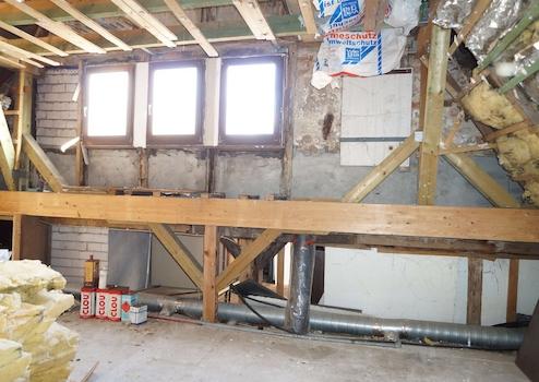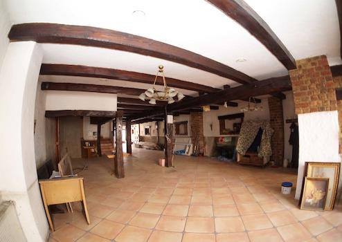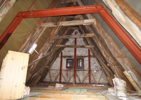 Das Gebäude wurde in Fachwerkbauweise errichtet und verfügt über imposante Balken und Stützen im Innenbereich. Es gibt wenige Wände, die z.T. verändert oder entfernt werden können.