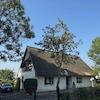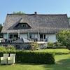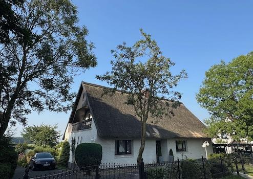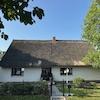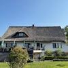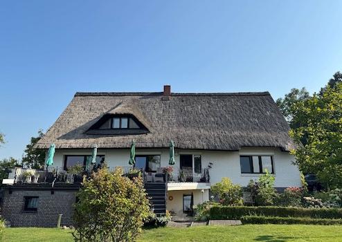 Das reetgedeckte Einfamilienhaus mit seinem weißen, rustikalen Klinker steht auf einem sonnigen Grundstück direkt am Feldrand.