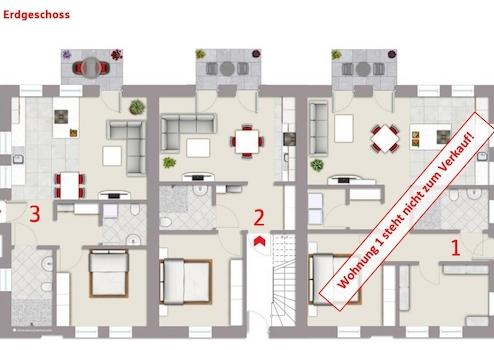Insgesamt werden drei 2-Zimmer-Wohnungen und eine 3-Zimmer-Wohnung zum Verkauf angeboten.