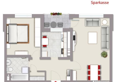 Flur, Wohnzimmer- und Esszimmer mit Zugang zum Balkon, Schlafzimmer, Küche mit Einbauküche, Duschbad, Abstellraum