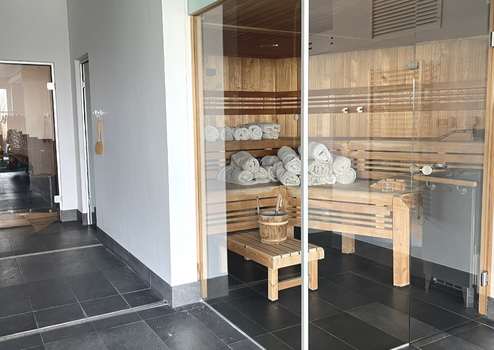 Wellnessbereich: Noch einmal kurz zurück zum Wellnessbereich im Erdgeschoss. Hier erwartet Sie eine Oase der Entspannung! Nach dem erfrischenden Bad im großen Schwimmbad mit Gegenstromanlage, bieten Ihnen Sauna und Dampfbad hervorragende Möglichkeiten zum Entspannen und Relaxen!