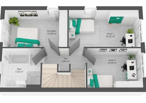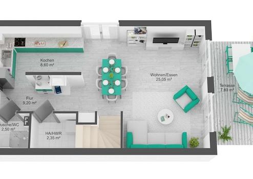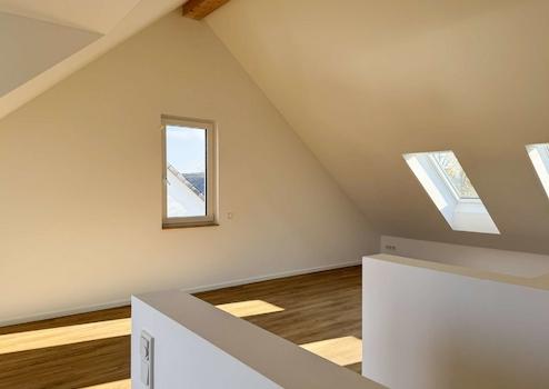 Im Erdgeschoss erwartet Sie ein offener Wohn- und Essbereich mit Zugang zur Terrasse und Garten, eine offene Küche mit Einbauküche, ein Gäste-WC mit Dusche und ein Hauswirtschaftsraum. Das erste Obergeschoss bietet zwei flexibel nutzbare Zimmer, ein großzügiges Schlafzimmer und ein stilvolles Tageslichtbad. Das Dachgeschoss überzeugt mit einem lichtdurchfluteten Studio, ideal als Arbeits- oder Gästezimmer.