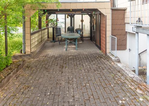 Wohn-/Esszimmer mit angrenzender Küche und Zugang zur überdachten Terrasse – Badezimmer mit bodengleicher Dusche – Eingangsdiele mit Treppe - Garage