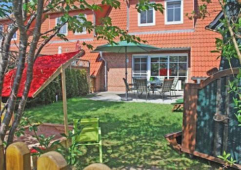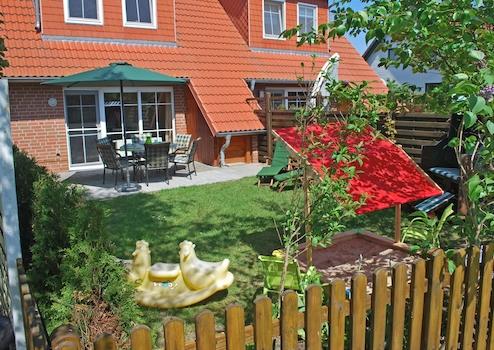 Auch ein Garten mit Terrasse mit Möblierung für 6 Personen, ein Strandkorb, zwei Sonnenliegen, ein Grill und WLAN mit bis zu 250MBit/s sind vorhanden.