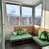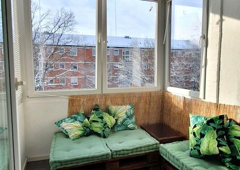 Der längliche Flur verbindet alle Räume miteinander. Rechts liegt die helle Küche mit moderner, weißer Einbauküche und praktischem Waschmaschinenanschluss. Gegenüber befindet sich das lichtdurchflutete Wohnzimmer mit Zugang zur gemütlichen Loggia, die aufgrund der Verglasung ganzjährig nutzbar ist.