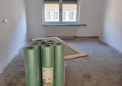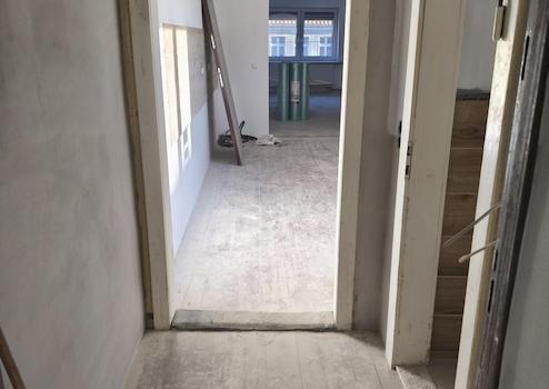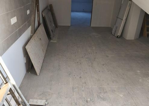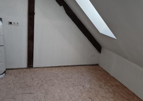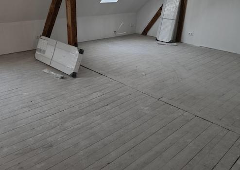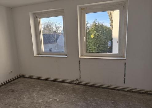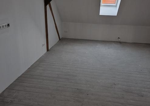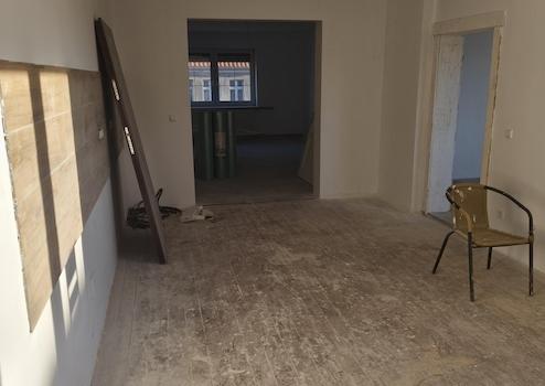 die Wohnung im Obergeschoß hat 3 riesige Zimmer + eine 26qm Wohnküche + Bad und einen kleinen Flur.