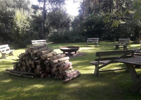 Auf der Süd- und Ostseite befindet sich eine große Terrasse mit anschließendem Park und Rasenfläche. Östlich befindet sich ein mit einer Hecke getrennter Parkplatz für ca. 20 PKW-Stellplätze.