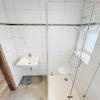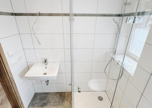 Das Bad verfügt über eine begehbare Dusche mit Glastür, ein WC und einen Spiegel