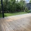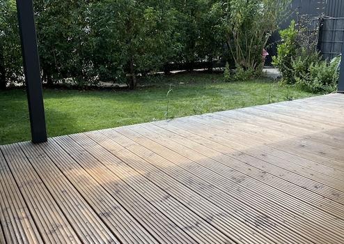 - Große Holzbodenterrasse mit Wasseranschluss und Steckdosen, komplett eingezäunt (Höhe vom Zaun: 1,2m)