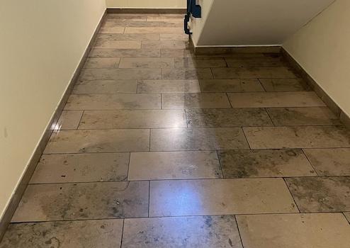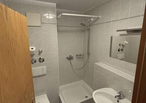 🛁 Helles Duschbad: komplett gefliest und leicht zu sauber zu halten.