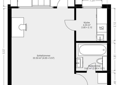 Der Wohn- und Schlafbereich wirkt durch den neuen Boden freundlich und einladend, die separate Küche ermöglicht eine klare Trennung von Wohn- und Kochbereich.
