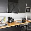 Offene Einbauküche, komplett ausgestattet mit Geschirrspüler, Gefrier-/Kühlschrank, Herd, Ofen, Mikrowelle, Zugang zur