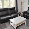 Wohn/Schlafzimmer mit Sofagarnitur, Couchtisch, Schreibtisch mit Stuhl, Kommode, Kein TV, Boxspring-Bett 180 x 200 cm.