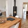 Esszimmer mit großem Esstisch mit Sitzbank, und 4 Stühlen, Kaminofen, Büffetschrank.