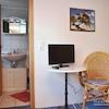 3. Schlafzimmer 9 qm mit Bett 1 m, Nachttisch, Schrank, Tisch, Stuhl, Fernseher, Duschbad.