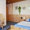 2. Schlafzimmer 10 qm mit Bett 1 m, Nachttisch, Schrank, Tisch, Stuhl, Fernseher, Duschbad.