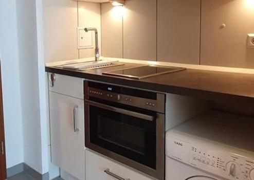 Offene Küchenzeile im Eingangsbereich, komplett ausgestattet mit kleiner Waschmaschine.