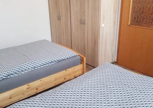Schlafzimmer mit 2 Einzelbetten, 2 Nachttische, 2 Kleiderschränke, Tisch, 2 Stühle,Deckenfluter.