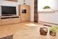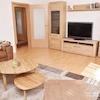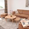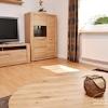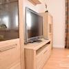 Wohnzimmer mit Ecksofa, Couchtisch, Wohnzimmerschrank mit Kabel-TV.