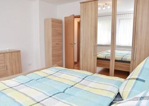 Schlafzimmer mit Bett 190x200 cm, Kleiderschrank, Nachttische, Schrank.