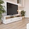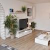 Wohnzimmer mit weißem Ecksofa, Couchtisch, Wohnwand, Flachbild-TV