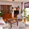 Wohnzimmer ca. 30 qm mit 2 Sofas 3+2-Sitzer, Sessel, Glastisch, Vitrinenschrank, Tisch mit 3 Stühlen, Flachbild-Kabel-TV, Zugang zur