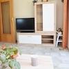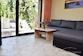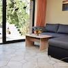 Wohnraum mit Funktionssofa, Couchtisch, SAT-TV auf Lowboard, Vitrine, Zugang zur