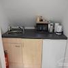 Pantryküche, ausgestattet mit Mikrowelle, Wasserkocher, Toaster und Spüle (kein Herd) Kühlschrank.