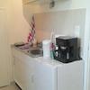 Einbauküche komplett ausgestattet mit Siebträgerkaffeemaschine, Wasserkocher, Kühl-/Gefrierschrank, Mikrowelle, Kochplatte mit 2 Kochfeldern, viel Stauraum.