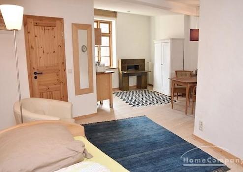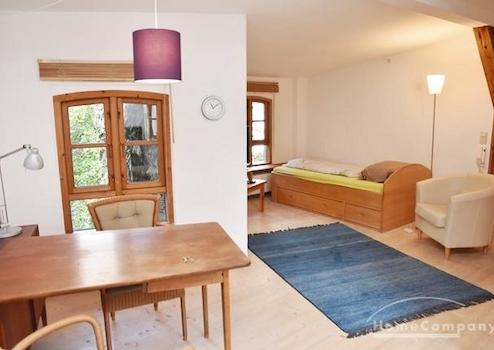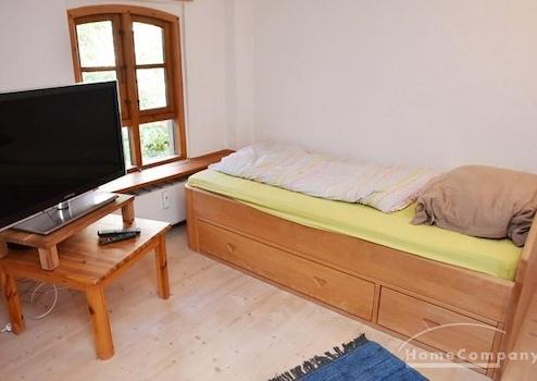 Helles Wohn/Schlafzimmer 30 qm mit 1m Einzelbett, TV-Tisch, Couchtisch, Ledersessel, Sekretär, Schrank, Internet-TV, T-Home Entertain. DVD-Player, Stereoanlage/ MP3, schnurloses digitales Telefon, Kommode, geseifte Holzdielen, 2 moderne Woll-Teppiche(Gabbeh/Kelim), Pantryküche mit 2*-Gefrierfach 5*****, Kombi-Mikrowelle, Wohnung ist komplett eingerichtet.