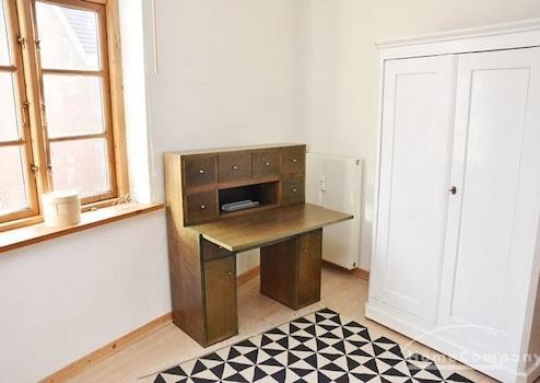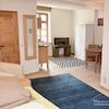 Sehr helle und freundliche Wohnung im 1. OG eines alten Speichers in idyllischer Lage auf Reiterhof in Lehrte. Eigener Eingang über Außentreppe. Wohnraum mit 2 Sesseln, Tischchen, Regalen, Smart-TV (noch nicht auf Bild ...
