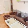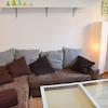 Wohnzimmer mit Couch, Couchtisch, Sessel, Wohnzimmerschrank, DVBT-TV mit DVD-Player, Schreibtisch mit Stuhl, Kleiderschrank, Durchgang zum