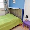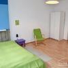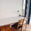 Schlaf/Arbeitszimmer mit Bett 140x200 cm, Kleiderschrank, Schreibtisch mit Stuhl.