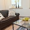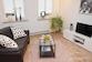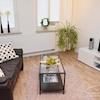 Wohnzimmer mit Sofa, Relaxsessel, Couchtisch, Vitrinenschrank, Lowboard mit Smart-TV (Internet DSL 50 MBit inklusive).