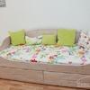 Schlafzimmer mit Bett 140x200 cm, Kleiderschrank, Nachttischchen.
