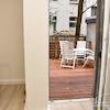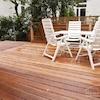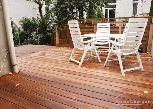 Holzterrasse mit Gartenmöbeln. Zugang auch vom Schlafzimmer.