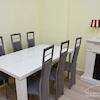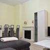 Wohnzimmer mit großem Funktionssofa, Lowboard mit Flatscreen-TV, Couchtisch, Esstisch mit 6 Stühlen, Kaminattrappe.