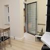 Modernes Duschbad/WC mit Waschmaschine.