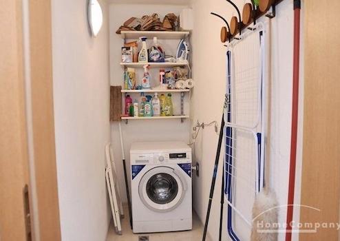 Hauswirtschaftsraum mit Waschmaschine und Regalen.