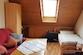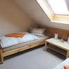 Schlafzimmer mit 2 Einzelbetten (Kiefer), Kleiderschrank, Tisch, 2 Stühlen, Teppichboden.